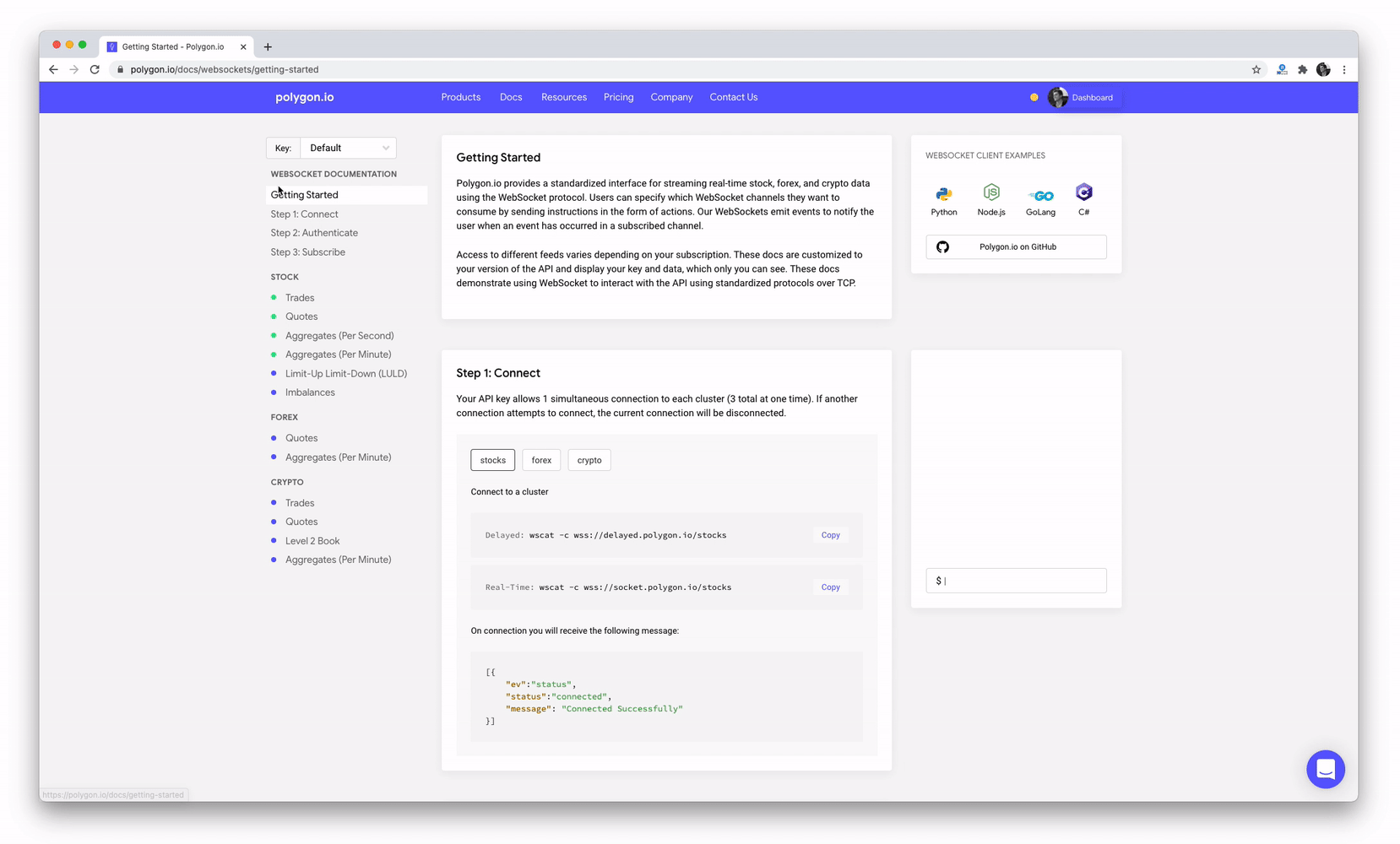 We've updated the user interface on our WebSocket documentation according to our latest design patterns. An updated wscat example makes connecting to streaming data from stocks, forex, and crypto as easy as 1,2,3. New inputs make it easier to define parameters, and the updated scrolling behavior ensures everything you need is always within view.