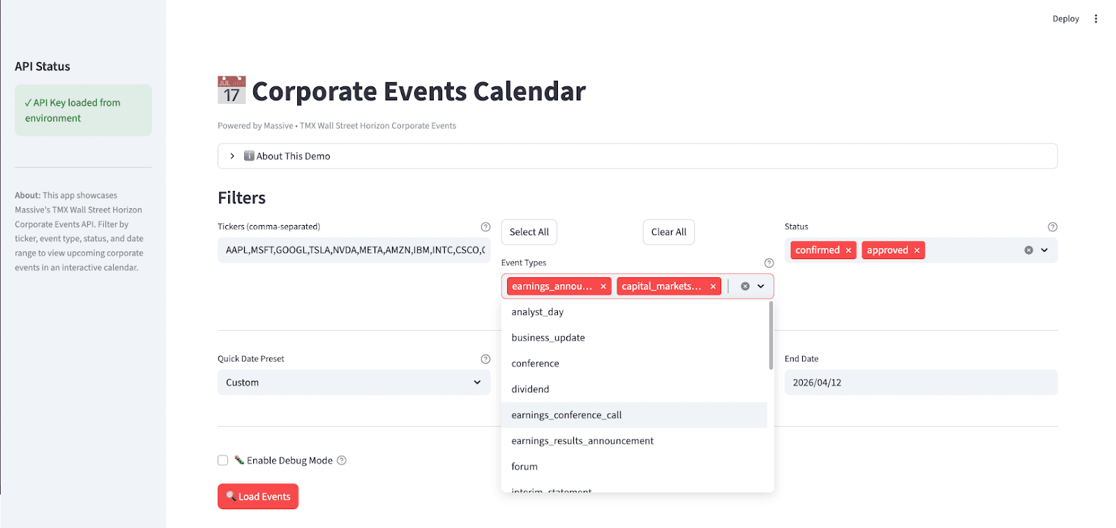 This demo is intentionally designed to be both educational and extensible. You can run it as-is to explore TMX Wall Street Horizon Corporate Events data, or use it as a reference for building your own event tracking tools, dashboards, or production workflows on top of Massive's API.