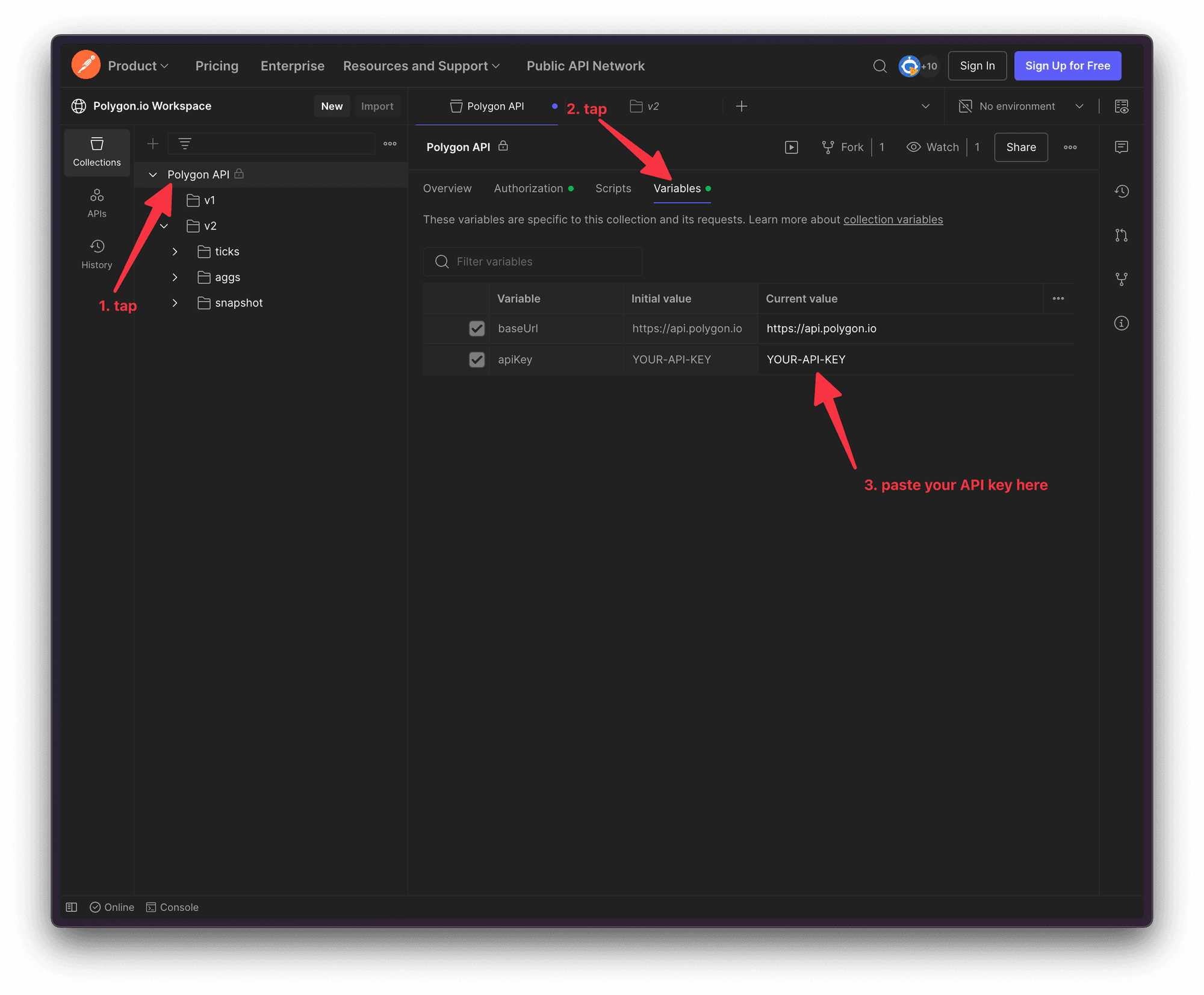Once imported, you need to add your Massive.com API keys to the collection variables. If you don't have a Massive.com account, you can sign up for free to get started. Once logged in, copy your API key from the dashboard.