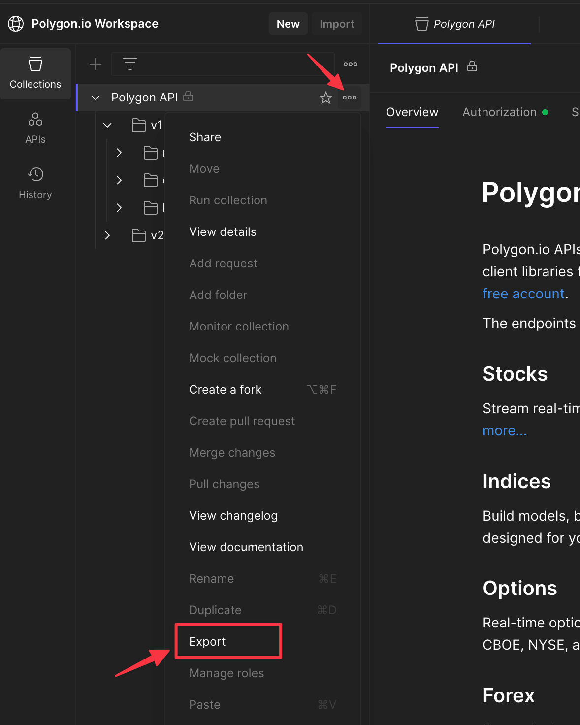 As we continue to invest in optimizing the developer experience at Massive and provide tools to help you be more productive, we published the official Massive.com Postman collection. In this collection, you will find all of the public endpoints we support for Stocks, Indices, Options, Forex, and Crypto. At the time of writing, Postman doesn't allow you to create requests from public workspaces. To use the collection, you can either fork it into your own private workspace, or export the collection and import it via the desktop app.