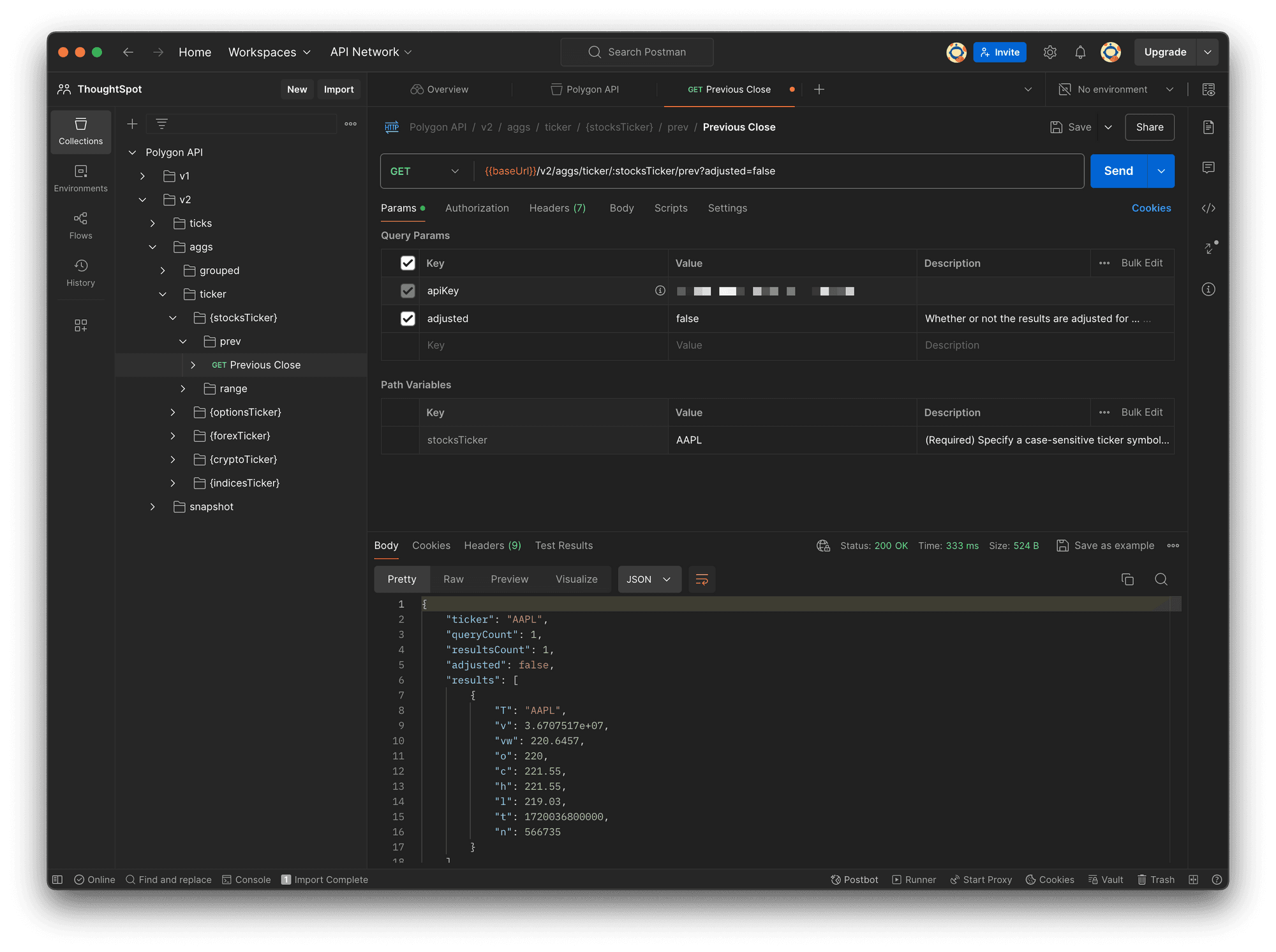 Looking at the docs, we can see that Previous Close requires a query param, adjusted, and variable, ticker to be set. Tap on the Params tab, enter the values below, then tap Send to see the results.