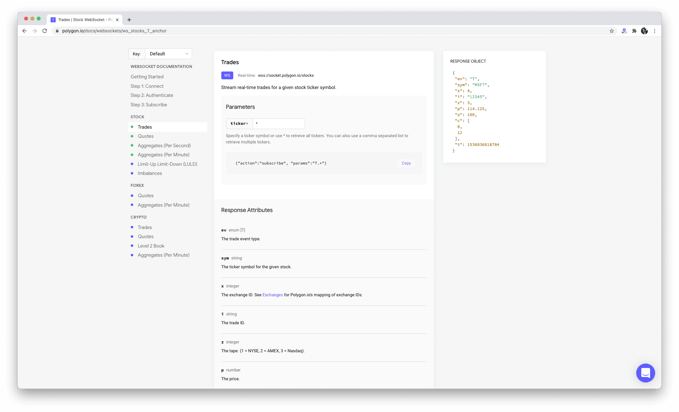 We've updated the user interface on our WebSocket documentation according to our latest design patterns. An updated wscat example makes connecting to streaming data from stocks, forex, and crypto as easy as 1,2,3. New inputs make it easier to define parameters, and the updated scrolling behavior ensures everything you need is always within view.
