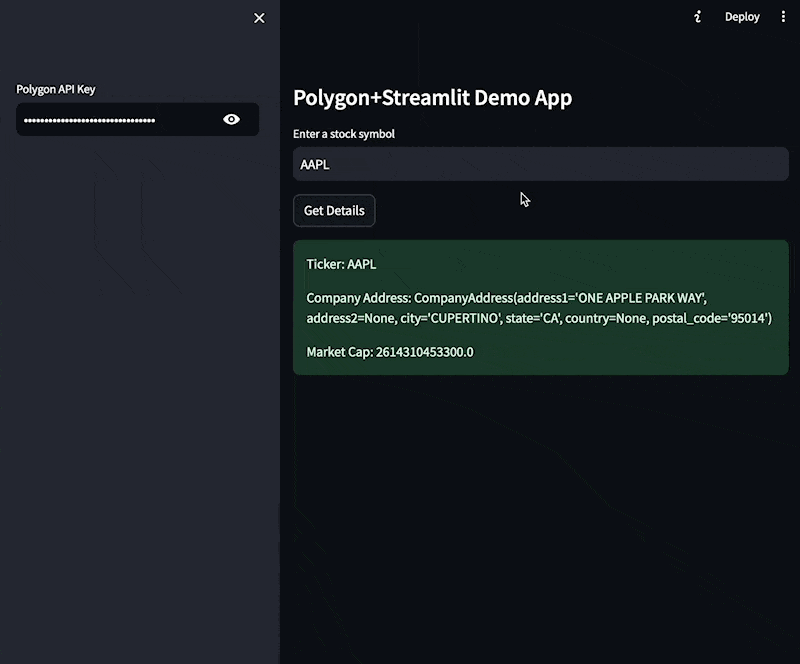 st.subheader("Massive+Streamlit Demo App") symbol = st.text_input("Enter a stock symbol", "AAPL") with st.sidebar: #Get your Massive API key from the dashboard. #In a real app you want to store this as a secret in your .env massive_api_key = st.text_input("Massive API Key", type="password") # Authenticate with the Massive API client = RESTClient(massive_api_key) col1, col2, col3 = st.columns(3)