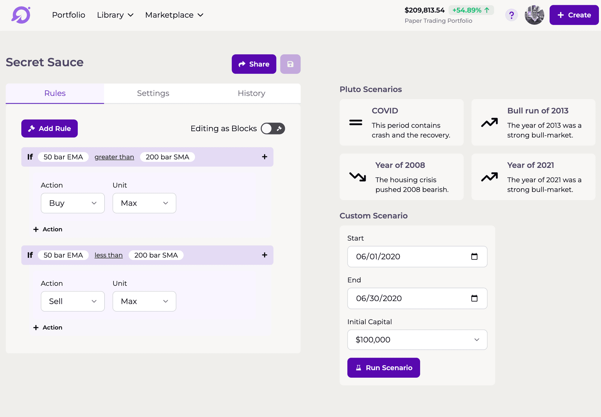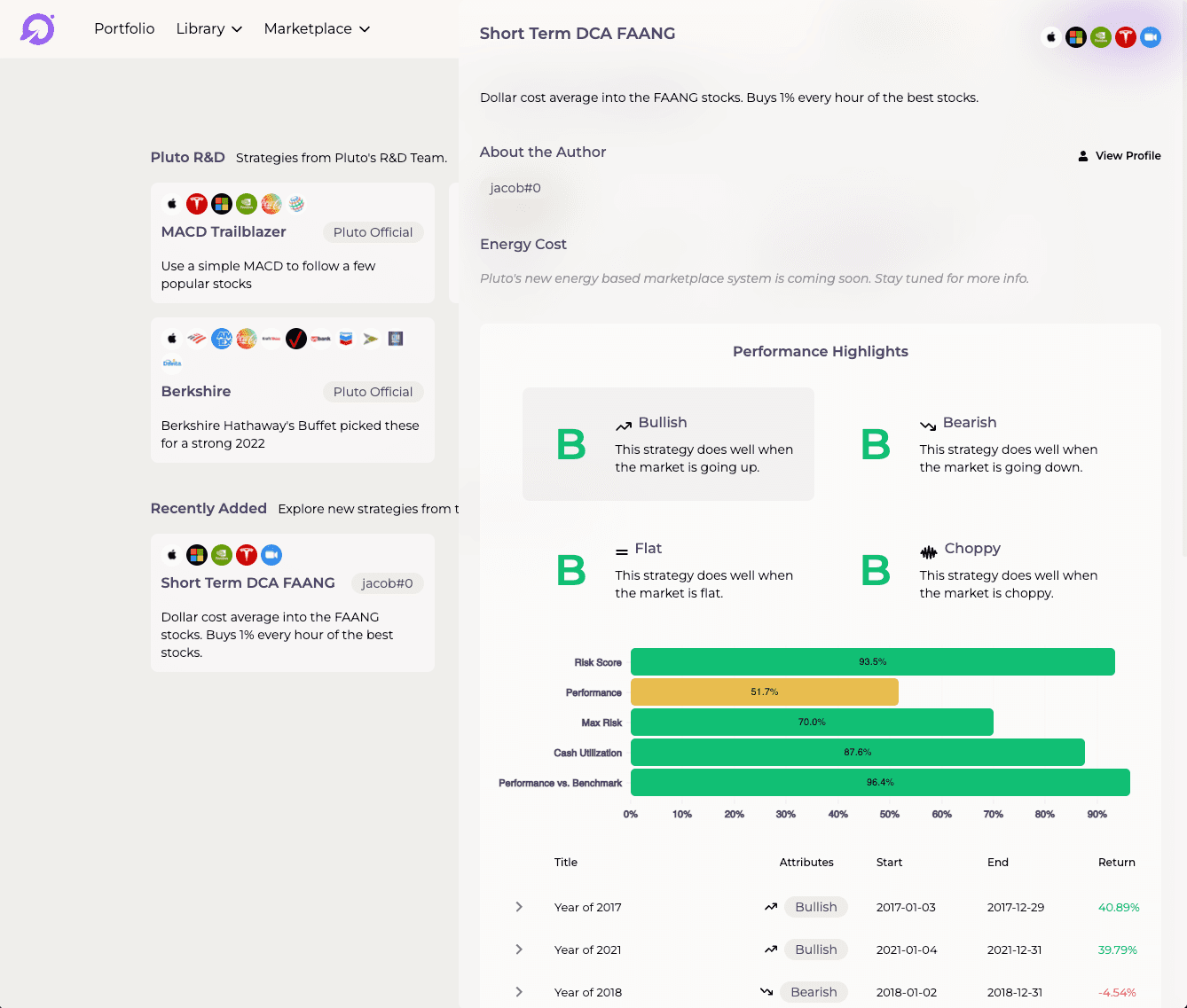 Pluto's Marketplace features a few strategies which are available out of the box for all users of the platform, such as a simple RSI scanner and strategies based on Ray Dalio’s seminal investing advice.