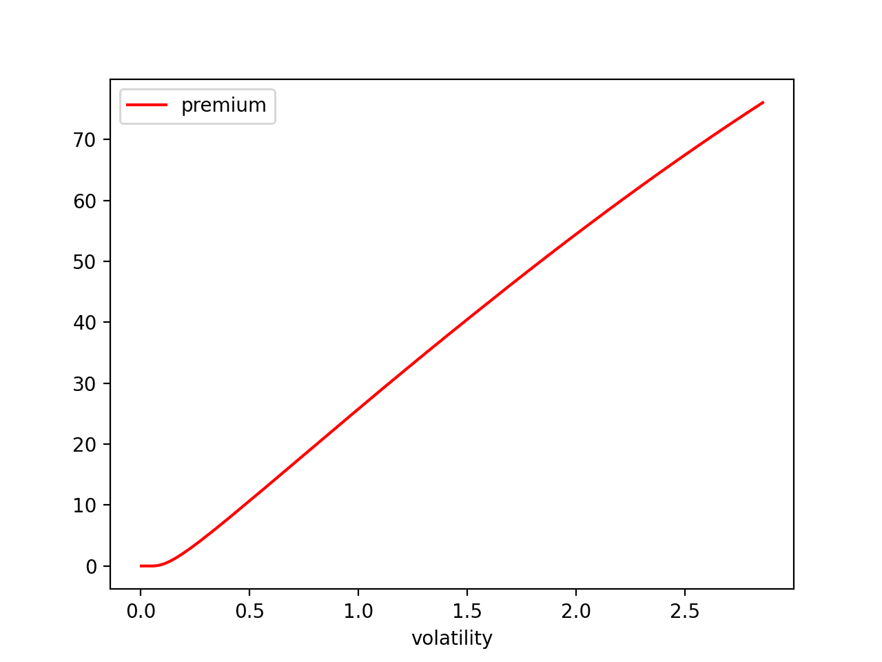 As we can see in the very simple graph above, volatility and premium are almost linearly related. The higher the volatility, the greater premium demanded for the option. Note that other factors such as the spot price (price of the underlying stock), interest rates, and the passage of time can affect this curve. For example, if the time to maturity was instead 30 days, the chart would look like this: