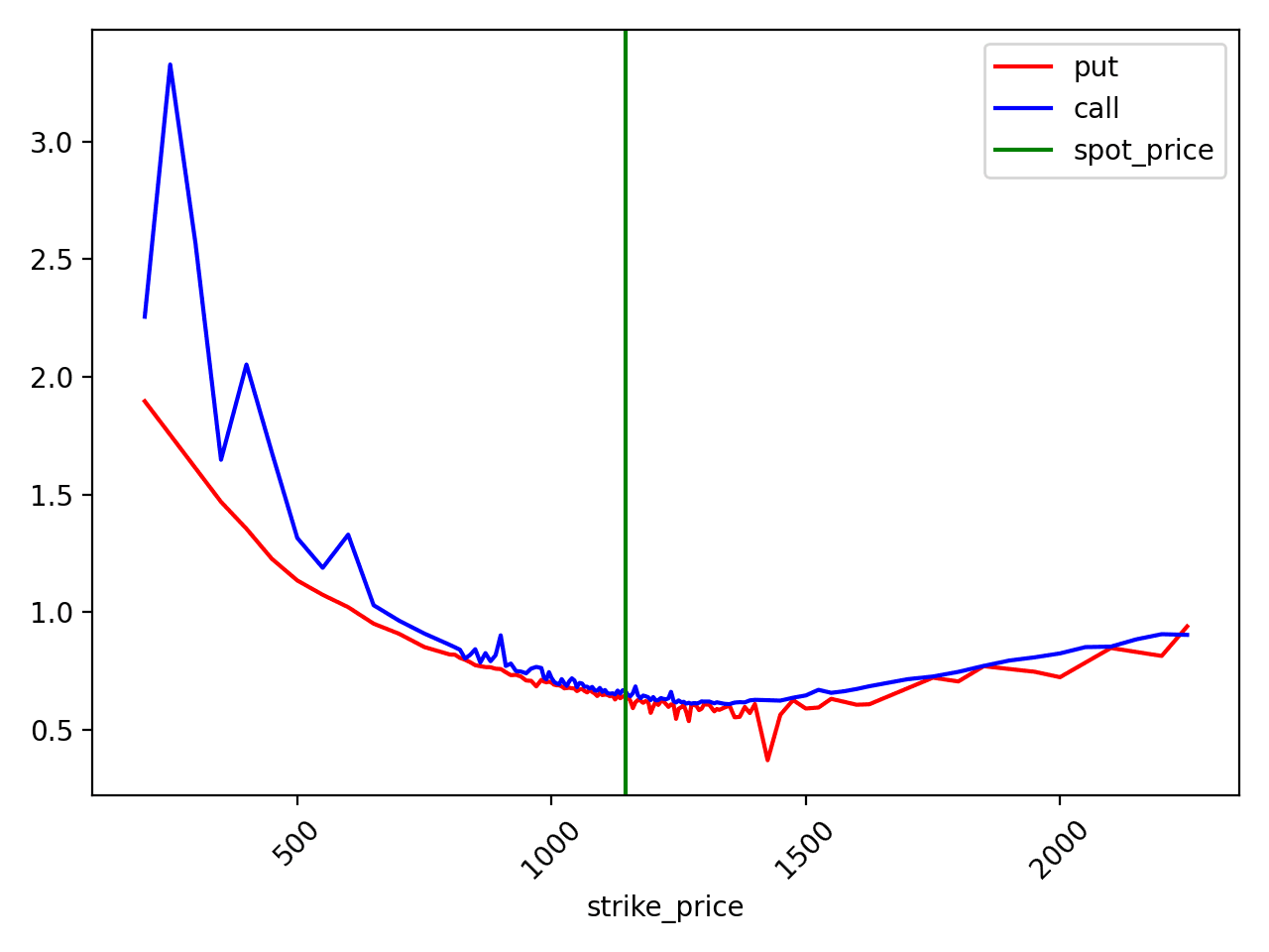 When everything was said and done, we began running tests on some random contracts. We noticed that between 10-15% of contracts cause our model to fail, as their market prices violated no-arbitrage bounds on an option's premium. Briefly, for in-the-money options the premium should never fall below the intrinsic (exercise) value, otherwise this would represent an arbitrage opportunity. (For out-of-the-money options the intrinsic value is zero, so this never happens.) For example, suppose a trader is buying one contract of TSLA211203C01020000: that is, a call on TSLA expiring on Dec 3 2021 with a strike price of $1020 per share. (See How To Read A Stock Options Ticker.) If the spot price for TSLA were $1140 and they were able to buy a contract at $100 per share, they could profit instantly by exercising, buying at the strike price of $1020 and selling at $1140, pocketing $120 per share and a net profit of $20 per share. This constitutes arbitrage, something our pricing model assumes doesn't exist in the real world.