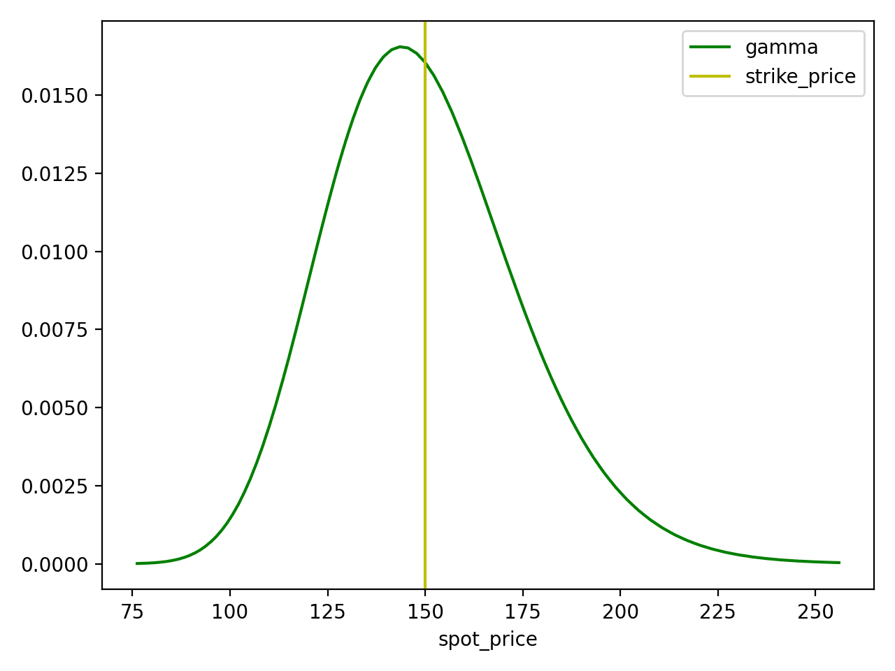 Gamma (Γ) measures delta's sensitivity with respect to the price of the underlying. Because gamma measures change in delta, which in turn measures change of the option's premium, gamma is referred to as a second order Greek. For example, if gamma is 0.01, a $1.00 change in the underlying price would approximately net a 0.01 change in delta. Gamma is highest at the money, which is to say that delta changes quickly at the money. It is even higher for at-the-money options near expiry.