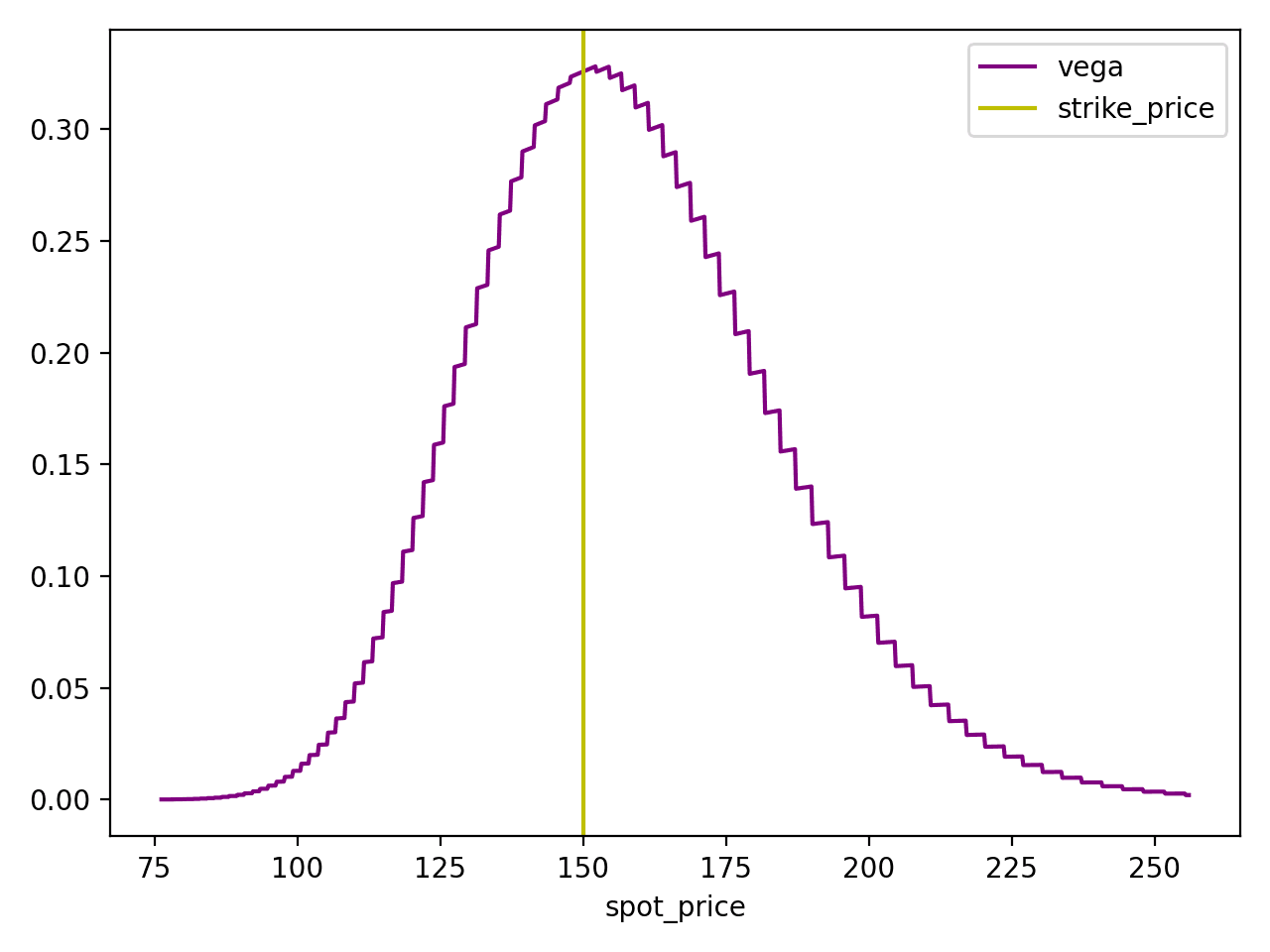 (Unlike the other Greeks, the model we chose doesn't provide convenient estimates for vega, so we have to resort to finite differences. The choppiness in the plot is probably an artifact of this method.)