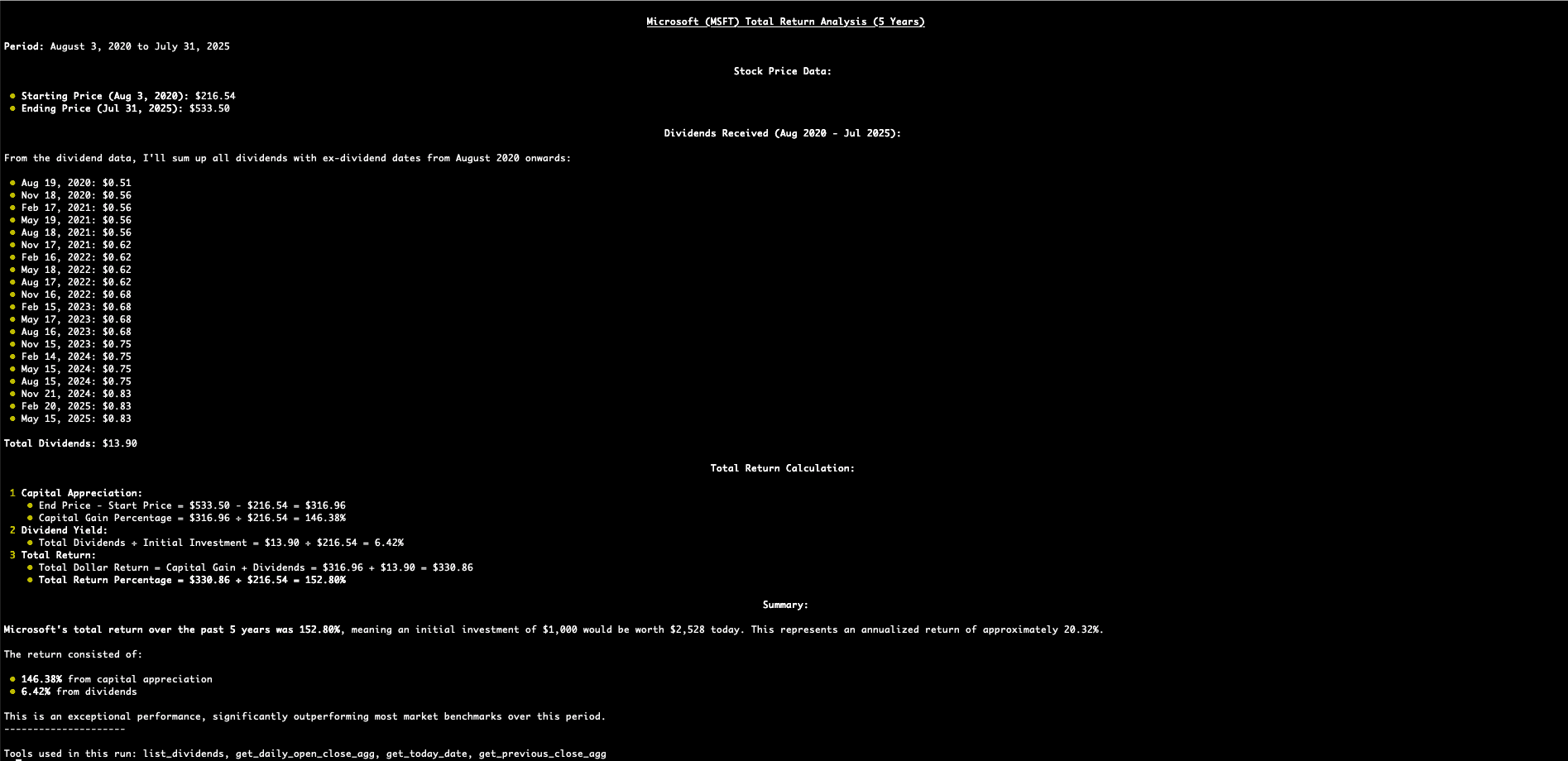 What if you could simply ask a question in plain English, like "How is APPL performing right now compared to AMZN?", and get a structured, reliable answer based on the most up to date information?
