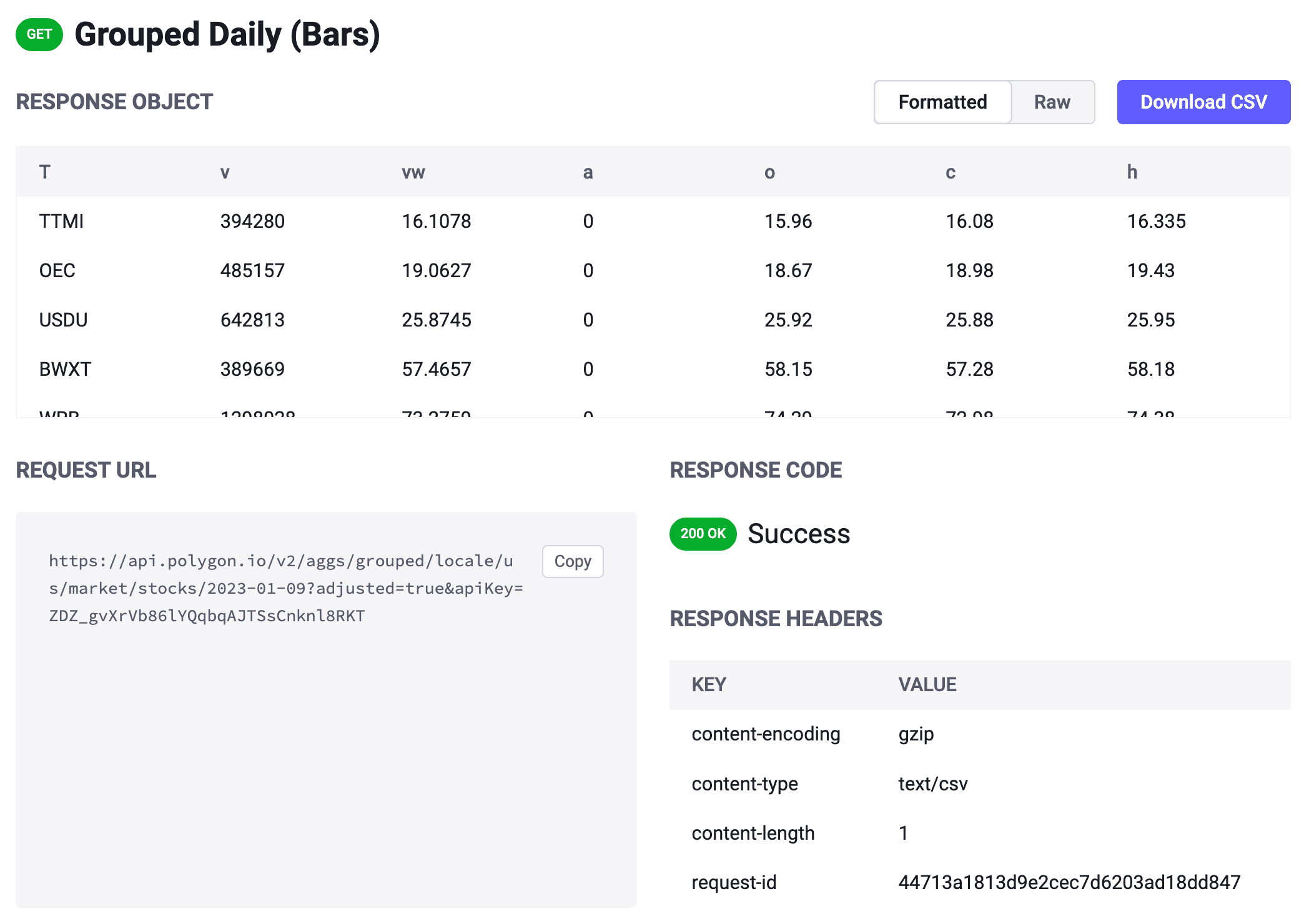 Here's what the output looks like when making a request to the Group Daily (Bars) API in CSV format. As you can see from the example below, the data is returned in a comma-separated format with each line representing a single data point. This makes it easy to process and analyze the data using tools like Excel or Python.